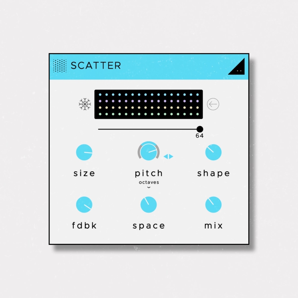 SCATTER is a unique granular cloud generator. Create beautiful soundscapes from incoming audio, modulate the pitch, then send it through a huge reverb. SCATTER is a simple to use but huge in sound.
