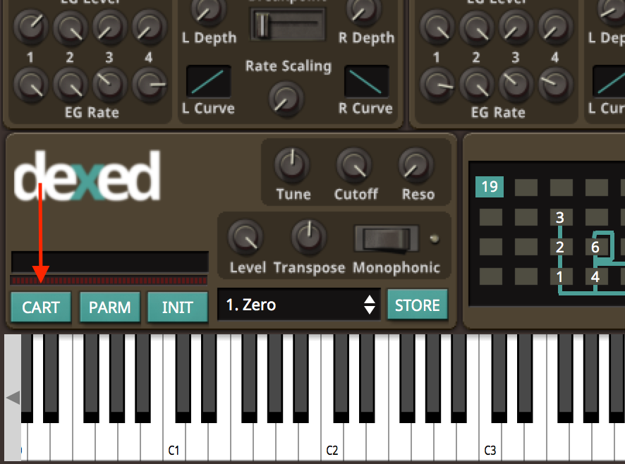 Close the ‘Parm’ window in Dexed and click ‘Cart’ bottom left of the window to open up the cartridges page: