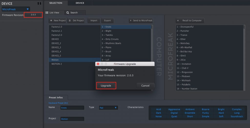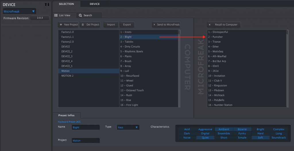 Before you install any presets, it’s recommended that you backup the presets currently on your MicroFreak. Just click ‘Recall To Computer’ and your device will be saved as a Project named ‘Device’ in the computer section. A project consists of presets and banks.