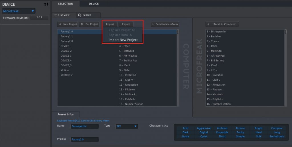 Locate your Project file and open it. You can then send the whole project to the MicroFreak (doing so overwrites over your current presets on your MF, so back up first as mentioned above), drag and drop files individually from the project into your MicroFreak or drag them onto other programs on your computer. The workflow is exactly the same for Banks and Presets – instead of clicking ‘Import New Project’ you’ll just click import Preset or Bank. Depending on your preset pack, you should have either Project, Banks or Preset files.