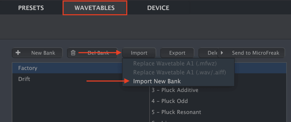 If you wish to install or create other wavetable banks, all you need to do create a new bank and drag and drop Wav files onto the Wavetable list, and then drag them over to your MicroFreak bank.