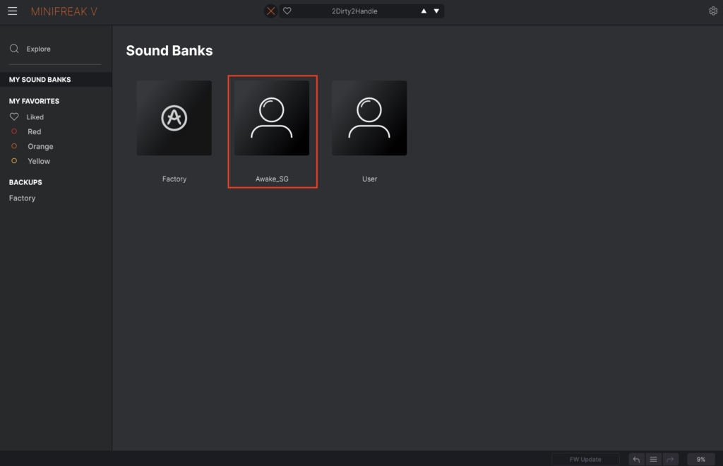 You can access your banks from the preset menu, where you should now see your bank (or Awake_SG if you’re using our presets). Â