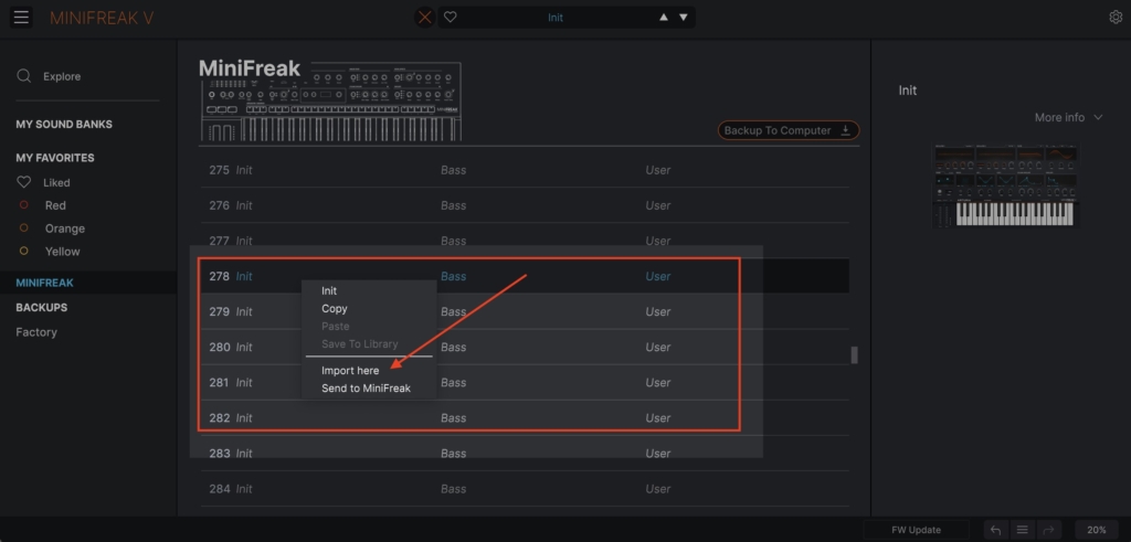 Then select the MiniFreak from the left panel to display the presets saved onto the device: