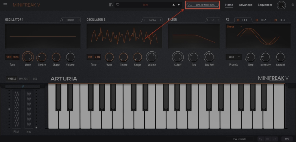 Once the plugin is installed, connect the hardware MiniFreak to your computer via the USB port, open up a DAW and then open the MiniFreak V plugin. Click the ‘Link to MiniFreak’ button: