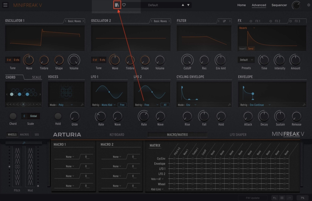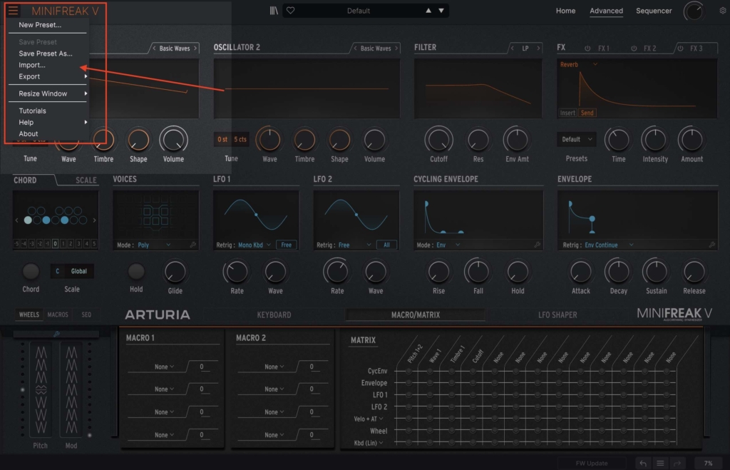 Wait a moment for your MiniFreak to connect. Once connected, the software will mirror the hardware. To import the presets into the hardware, first open the preset menu: