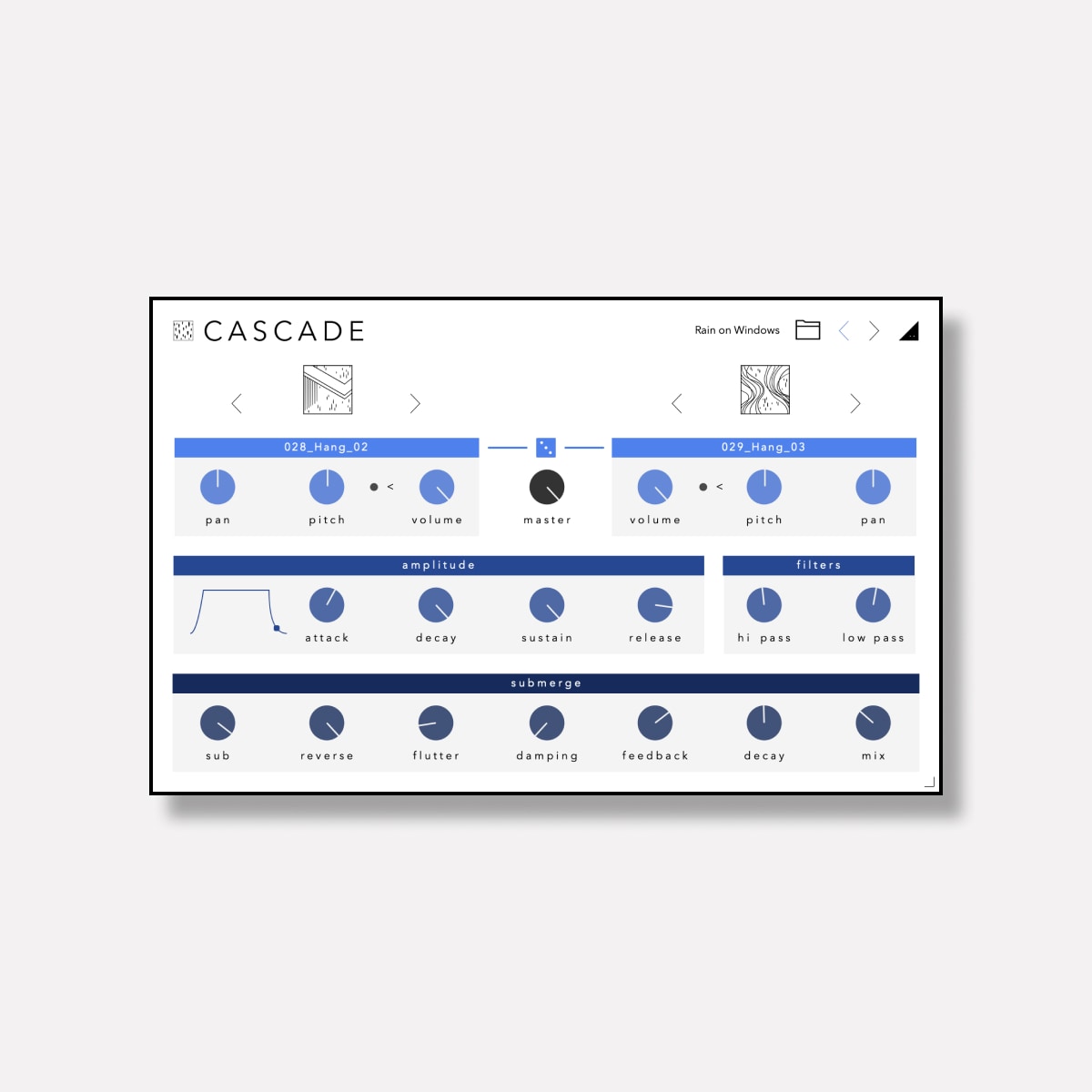 cascade includes 2 layers, each containing 100 textural layers crafted from acoustic instruments, and a few electronic for taste. each source is a unique texture which when combined with other sound sources and your playing, create cascaded soundscapes. you can also click the dice icon to randomly select new layers.