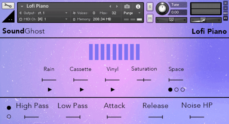 Extreme care was taken in removing the cassette noise from the original recordings and providing it as a separate control. Not only do you have direct control of the cassette noise level and filtering of the noise, we’ve also provided rain and vinyl noise sources. Add rain for a sad lo-fi atmosphere, blend with cassette noise and add some vinyl crackle to your taste.