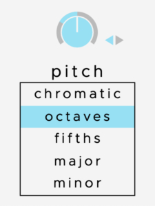 you can easily lock the pitch transposition control to chromatic, octaves, fifths and minor/major notches, then add random modulation to your taste via the outer ring. pitch modulation is where the magic happens with scatter, as it also changes the grain size. choose from 3 directions of pitch modulation: up, down or in both directions. scatter comes alive in octaves mode and is selected by default.